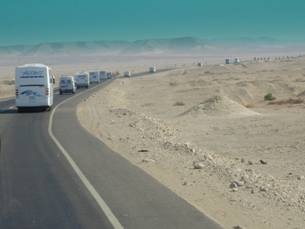 照完這座清真寺的外觀後,剛好午飯時間也到了,今天下午的活動是參觀Bedouin貝都因民族的家,飯店外已經等了三部吉普車,Toyota的,由四個貝都因男人來開,也只有他們可以開,因為在變化多多的沙漠裡只有貝都因自己才可以用不同的路還找得到自己的家,Hassan說也因為這樣很多貝都因是靠買賣毒品來過活,因為警察很難抓到他們;我們即將參觀的當然不是販毒家族,是靠觀光客過活的貝都因家族。