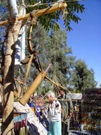 婦人坐在地上織,又有一個男人在身邊保護牠,可以跟她合照,附近有鐵飯碗