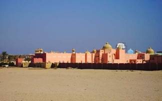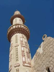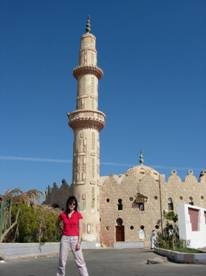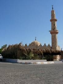 在這除了飯店什麼也沒有的地方,竟然有一棟小小的清真寺,就在我住的旅館旁邊而已,孤伶伶地站在兩座五星飯店之間;也難怪,在埃及人口裡有百分之九十是穆斯林。我們走一走繞過這棟清真寺時,有一位埃及男士走過來,問我們是否想參觀清真寺裡面,如果要的話就得等晚上七點過後,因為現在還在使用中,好親切的穆斯林呀!在我老家印尼其實也有不少清真寺,可是我一點也不敢靠近,因為穆斯林多半是印尼人,而印尼人多半不歡迎華人,所以在腦海裡產生刻板印象說:「進清真斯的華人一定會被打」,是真是還假我就不敢證明囉!