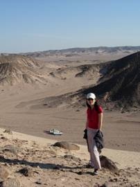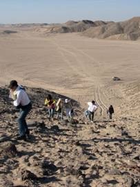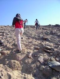 車子繼續往前開到第二站:「滑沙」,遠看到一座石頭山丘,司機也沒有轉彎也沒有減速,直直地向那堵斜牆衝,我心想:「不會是要爬上去的吧!這可不好受呢!」,結果真的是爬上去,是用腳不是用吉普車爬的,好險!Hassan說這是我們滑沙的地方,車子停在山丘的腳下讓我們下來開始爬,看到那麼多大大小小的石頭,怎麼想也想不通這要怎麼滑?