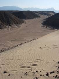 我坐下來試著滑,就是滑不下去,屁股表面不够寬啦!沒有準備板子,我看只能用滾的來滑沙吧!看著Hassan帶著男生們往下賽跑才知道是這樣「滑」的,或許Hassan的中文還需要加強一點吧!衝啊!