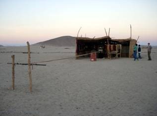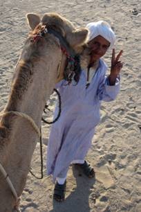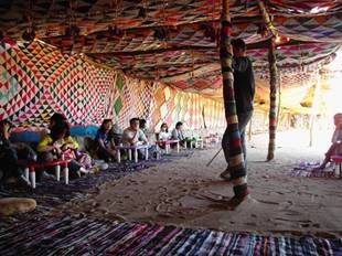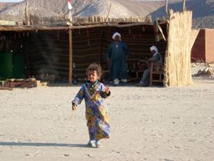 滑完沙後,車子繼續開往今天的重點行程:拜訪埃及的貝都因之家。貝都因Bedouin的名字源於阿拉伯語Bedu,沙漠居民之意。他們的祖先也是來自阿拉伯半島,順著牧羊群漫遊到西奈半島這裡。對的,貝都因是個遊牧民族,靠著放羊騎著駱駝各奔東西、沙漠殘酷的氣候搏鬥,走到有生存機會的地方就搭起羊皮帳棚暫時住下來。草坪都被吃光了再收拾東西找新的地方。那是在科技還沒侵犯沙漠的時候所能看到的畫面。在沒有GPS系統的情況之下,傳統遊牧民族的貝都因人得靠自己的五官來觀察四周變化、尋找生存機會。從沙中的痕跡就可以判斷誰來過這裡、在什麼時間、從什麼方向來的、去哪裡、帶了幾隻牧羊、甚至哪幾隻駱駝已經活了幾年都可以判斷出來呢!現在呢,靠觀光客賺錢不必搬來搬去了,用吉普車去城市賣手工藝品買可樂也不用忍受駱駝的怪脾氣,生活方便多了。但他們卻失去了最初吸引觀光客的純樸。可是如果為了滿足我們這些習慣方便的城市人而強迫他們過苦日子,會不會太自私了一點?想那麼多,人都來了,就盡情探索吧!