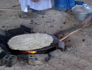 鐵盤底下燃燒的就是沙漠中最容易找到的材料:駱駝糞,這有點諷刺,沙漠很搶手的原因不就是石油嗎? 駱駝糞也好,烤出來的餅很香很好吃的呢!