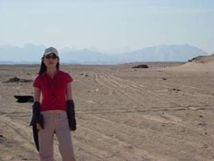 為了讓屁股和頭頂休息,路途中有停兩次讓我們下去走一走,第一站是「海市蜃樓」,就是在一片空地中突然有油油亮亮很像湖的景象,Hassan說有時候還會看到一排駱駝隊在前進呢!海市蜃樓會發生是因為當太陽光經過不同密度的空氣層時就會有折射作用,人的身體和心理狀態也會讓腦裡出現些影像,像我這種睡很飽的人就看不到駱駝隊了。