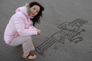 海水冷得無法讓我鼓起勇氣下去游泳,就在海灘上留下小小痕跡,把好幾天的壁畫記憶灌出來畫在沙上