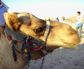 休息過後,一排沙漠之舟已經等著我們了,就是駱駝啦!駱駝之所以稱為「沙漠之舟」是因為牠們走路的方式:同一邊的前腳和後腳一起移動,這是因為腳太長的原因,像長頸鹿一樣需要時間擺動,所以當右邊的腳往前擺時,身體的重量先放左邊。等右腳踏好才把重量放右邊,而左腳開始動。這樣的動作遠看就好像滑行,所以駱駝獲得沙漠之舟之名囉!駱駝的身體結構也很「沙漠」。身上有兩層外套:第一層是很保暖的細毛、再披上粗粗長長的毛擋風沙,駱駝的腳底板很寬,走在沙漠上才不會陷進去,隨身背著一個「水壺」,慣例名詞是駱駝峰,裡面裝的不是水而是脂肪。有了這個水壺駱駝可以在六七個月內不喝水、一個星期不吃東西也不會沒力!非洲的駱駝是單峰,亞洲的才是雙峰,是什麼原因就得問造物者囉!活在沙漠中,暴風沙是一個難題,所以駱駝的耳朵裡長很長很厚的毛擋沙,鼻翼會自動關起來不用戴口罩。眼睛更是一大發明。為了防沙,牠有兩層又厚又長很讓人羨慕的睫毛。眼皮有三層,第三層是透明的所以在暴風沙來時就算牠閉上眼睛也還看得到路,而第二層眼皮像雨刷幫牠把沙子放一邊變眼屎。