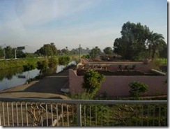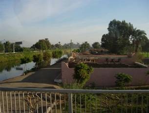 過橋後所看到的景:從尼羅河拉過來的水道、甘蔗田和幾乎沒頂蓋的農舍;住在這種地方,哪怕雨?