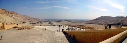 從第三層往下看,超壯觀的!右手那大塊廢墟就是Mentuhotep II法老的神廟所在地,Hatshepsut Temple在1891年被發現時也是個廢墟,考古學家慢慢把它再組合起來;遠方看得到尼羅河。