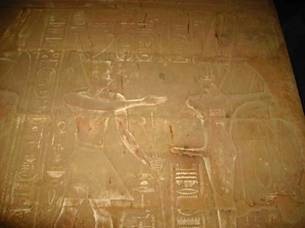 左邊那穿著圍裙的男生是法老,右邊只戴駝鳥羽毛做的帽子才是太陽神,有生殖能力的太陽神Amun Min;神跟人站的一樣高,就是差在那一點點東西兩人地位就差十萬八千里,好像動物在世上的責任只有生殖!