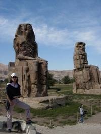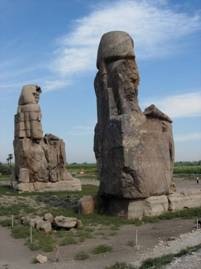 除了Luxor Temple,Amenhotep III法老還有別的超大型作品,是給他死後讓後代去拜他的神殿,據說是全埃及最大的工程呢!這座殿蓋在底比斯城,可惜蓋得太早,後代法老們拿他的石材來蓋自己的神殿,加上尼羅河數千年的氾濫和多次地震,現在能看到的只有兩座18米高的門神巨像,別看它們已面目全非,它們可是古羅馬人必參觀的景點之一!希臘作家Strabo和羅馬作家Pliny在它們的作品裡都有提到它們,連羅馬皇帝Hadrian約在西元130年特地跑來觀賞,就是因為它會唱歌!沒錯,每當太陽升起時,位置較偏北的巨像就會響,好像在迎接太陽的到來,因此古希臘人相信它們是特洛伊英雄Memnon正在為他母親黎明之神Eos唱歌,古希臘人就叫它們Collosi of Memnon了。科技當然不這麼認為囉,學著推出理論說是因為西元前27年有個大地震來破壞它們,加上沙漠地區的迅速熱脹冷縮,或著是風吹過細縫,使得它在早晨時會發出聲音。現在想聽它唱歌,門而都沒有,都怪一位羅馬皇帝Septimius多事,在西元199年下令給它們整修,毀了它的唱歌職業,變回純花瓶了!