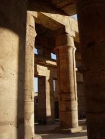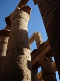 古埃及人的信仰也不像現代的信仰,當時是看執政的法老偏好哪一個神,那個神就變成流行宗教了。在這卡納克神殿區裡就有很多為不同神所蓋的神殿,最大的神殿有三個:神殿區最北的是Temple of Mont戰爭之神,現在除了基座什麼也看不到了、神殿區最南邊是Temple of Mut太陽神的妻子,目前只看得到幾塊倒塌的牆壁和馬蹄狀的聖湖而已、只有Temple of Amun太陽神還可以呈現當時人對神的崇拜所展現的毅力。怎麼說呢?Temple of Amun自己佔全區超過二分之三,在新王國時期時太陽神Amun是公眾最收歡迎的偶像,三十個法老法老互相比賽誰為太陽神所做的貢獻最大,結果真的很壯觀!主入口前就有兩排Ram headed Sphinx獅身山羊面像守護,有10座超大型塔門,80米乘100米的中廳,用134根巨柱撐住約5200平方米的主神殿,每一根都有22米高和3.5米粗呢,光看柱子脖子就酸了!每面牆每個角落都刻著當時法老與神的故事,刻得很仔細,還有幾座法老的雕像、超過19米高310噸重的方尖碑,隨便望都很「哇!」,我邊叫邊拍,一直拍,拍到「哇!相機沒電了!」