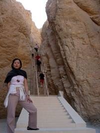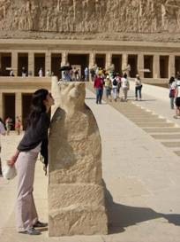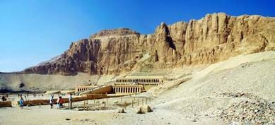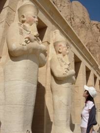 其實帝王谷外圍還有一區是貴族和高官的墳墓,被發現的已經有超過四百座,壁畫都不輸給皇家喔!看在時間有限的份上,盜墓課得告一段落,Hassan帶我們繞著山丘拜訪一位女法老。這個女法老的盛名逼得Thutmosis III連死後都得強調自己才是正統,她就是Hatshepsut。