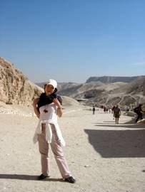 有沒有聽過「Valley of the Kings帝王谷」和「Valley of the Queens皇后谷」?我沒聽過,所以一聽到Hasan說這個名字時浮在我腦裡是法老王家的避暑宮殿,像歐洲那種一棟棟金色閃閃的宮殿蓋在一片很夢幻的草園上!車子越開,綠色的景物越少,當車子停在停車場時,四週圍連帶點綠的生物都沒有了,只看到一望無際的山丘大喊說:「歡迎來到帝王谷!」。