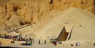 帝王谷和皇后谷位於很不起眼的Theban山區,地質只是一群石灰石山丘。Tuthmosis I看到祖先在一千多年前所蓋金字塔都被盜墓挖空了,當然想避開同樣的下場囉!他應該領悟到做人要低調一點了吧,所以決定為自己蓋了不顯眼的墳墓,看中了這Theban山區的不起眼,山的形狀又很像金字塔,就選中了這區蓋他的墳墓,後來的法老也跟著他的做法,陸陸續續蓋了62座墳墓,這就贏得「帝王谷」之名字。那法老的太太們呢?她們當然也有專用地區囉,是在帝王谷西南邊的峽谷,稱為「皇后谷」,那裡就有80座墳墓,最有名的一座是Ramses II的愛妻Nefertari,Ramses II就是在Abu Simbel蓋巨大神廟的那位。